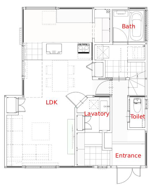 小さなお子さまやアウトドア後の帰宅を想定し、洗面を経由してLDKへ入れる動線を計画。