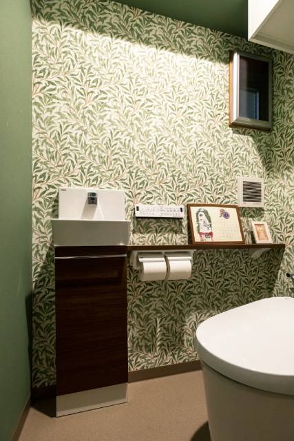 さらにアクセントクロスにはウィリアム・モリスの壁紙を選定し、シンプルなトイレ空間にさりげなく個性をプラスしました。