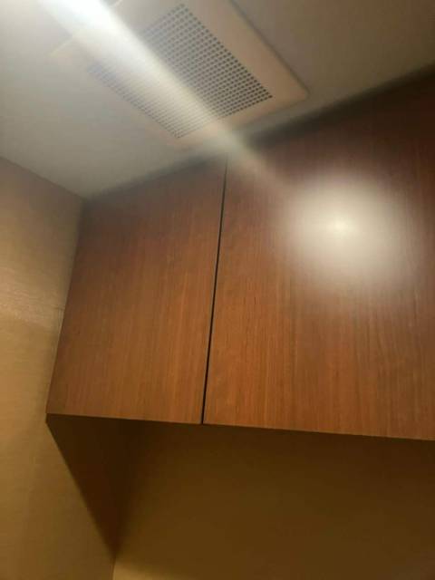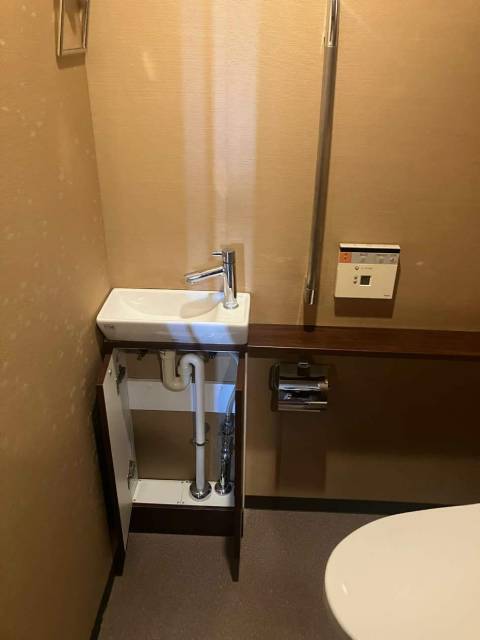 トイレは【Panasonic アラウーノ】を採用し、コストを抑えるために既存のダークブラウンの手洗いカウンターを再利用。